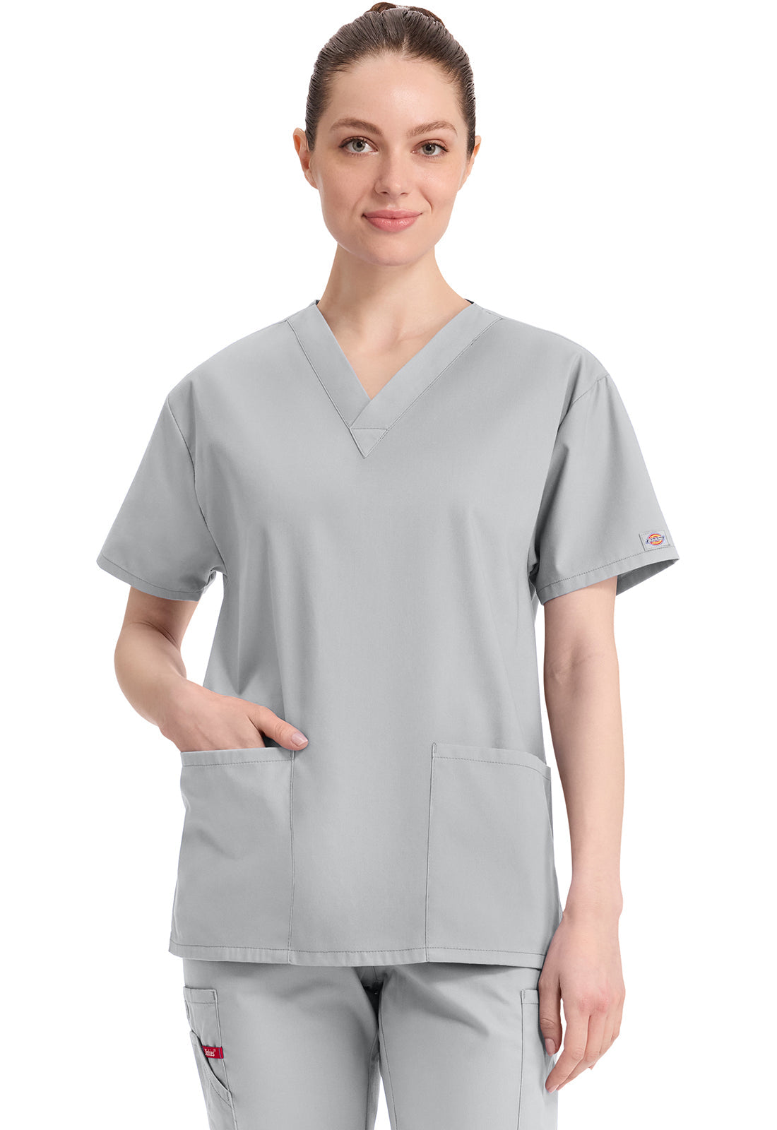 A Modern Classic fit V-neck top features Dickies logo twill tape at the back neck, patch pockets, a stretch Red knit interior pocket (White knit pocket on White) and side vents. Center back length: 27".